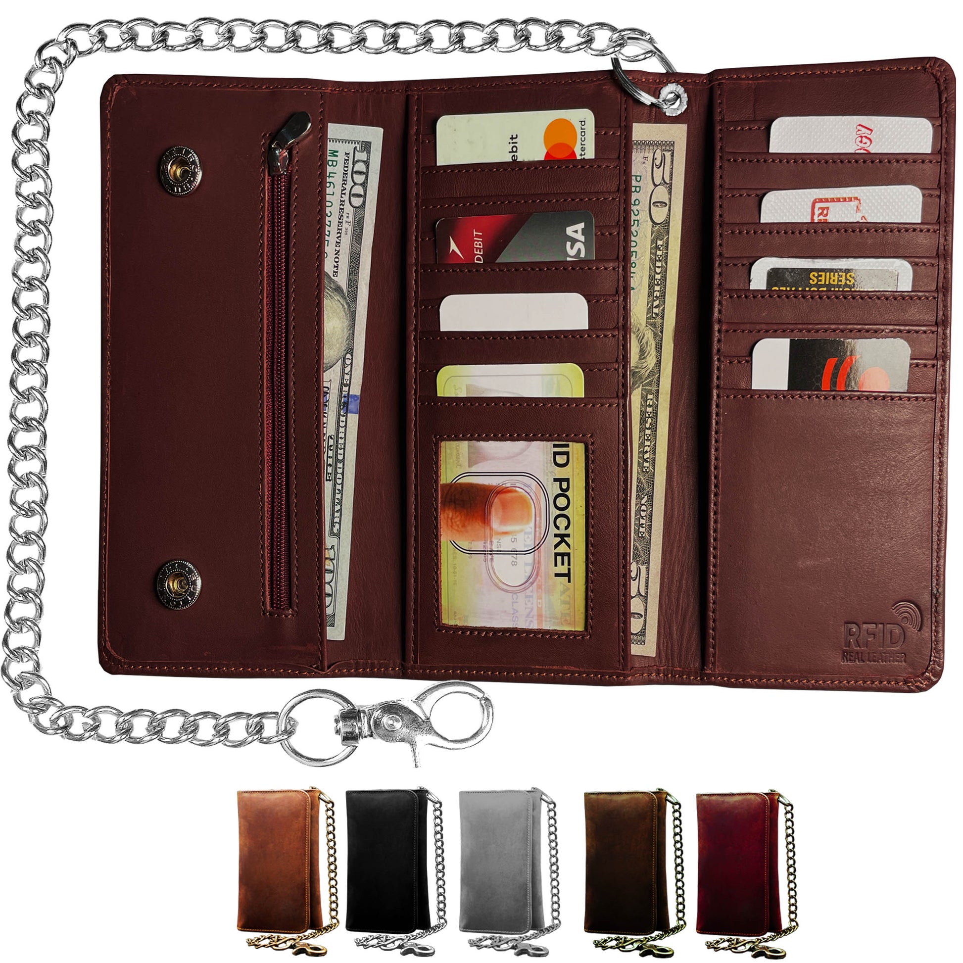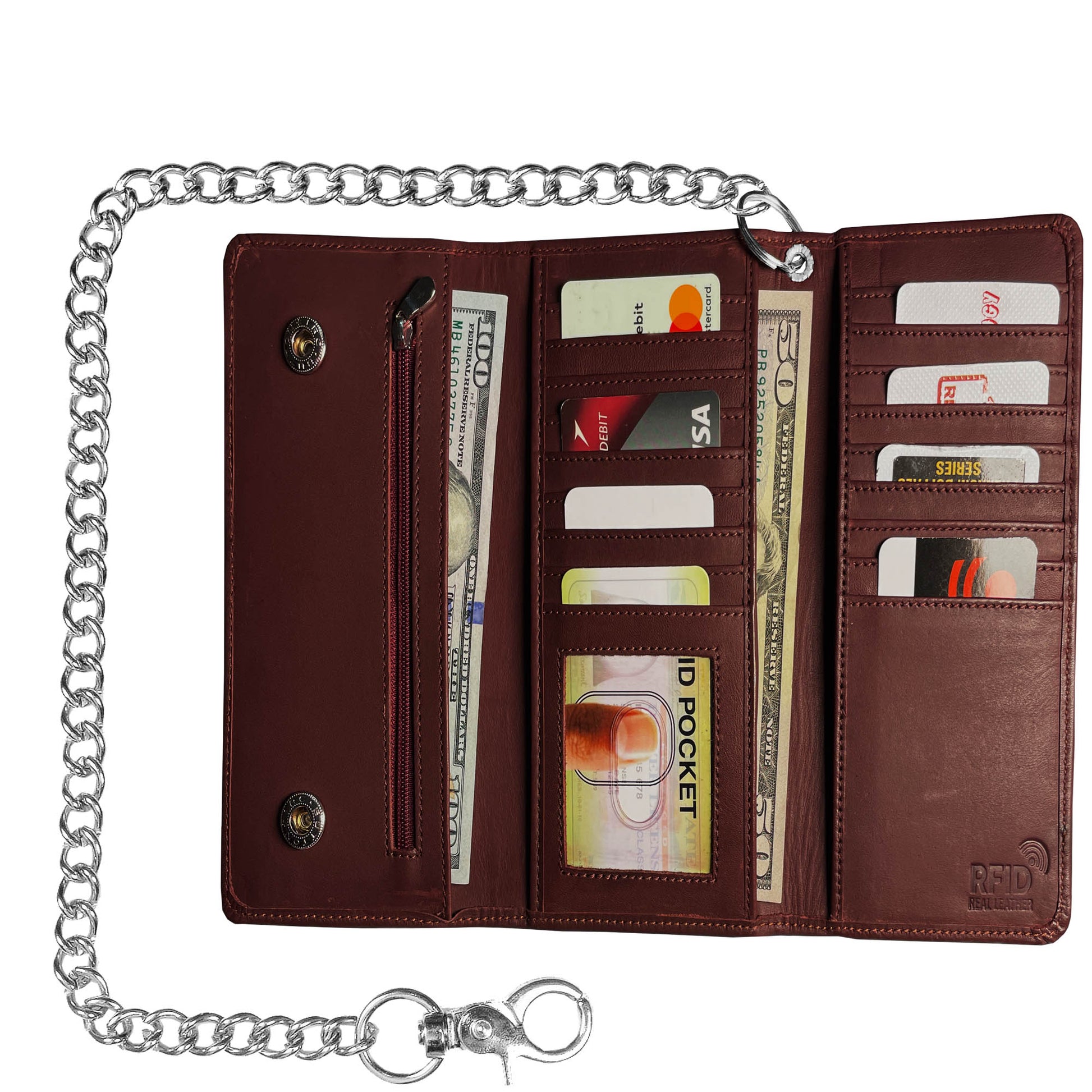 IBRO Motorcycle Chain Wallet for Men – 100% Natural Genuine Leather, Long Trifold RFID Blocking Wallet OXBlood